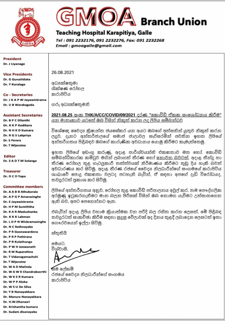 නමුත් රජයේ වෛද්ය නිලධාරීන්ගේ සංගමයේ ලිපි ශීර්ෂ භාවිතා කරමින් නිලවරණය හැර වෙනත් කිසිවක් සිදුනොකරන ලෙස අධිකරණය දුන් නියෝගය පවා නොතකා හරිමින් කටයුතු කළ රජයේ වෛද්ය නිලධාරීවරුන්ගේ සංගමයේ සම ලේකම්වරයකු විසින්, එම තීරණ අදාල පර්ශවයන්හි එකඟතාවය මත හෝ කොවිඩ් සම්බන්ධීකාරක කමිටුව මගින් හෝ ලබාගත් තීරණ නොවන බවත්, අදාල තීන්දු හා තීරණ රෝහල තුළ ගැටලුකාරී තත්වයක් නිර්මාණය කිරීමට තුඩුදිය හැකි බවත් පවසමින් විරෝධය දක්වා ලිපියක් යවා තිබේ.
