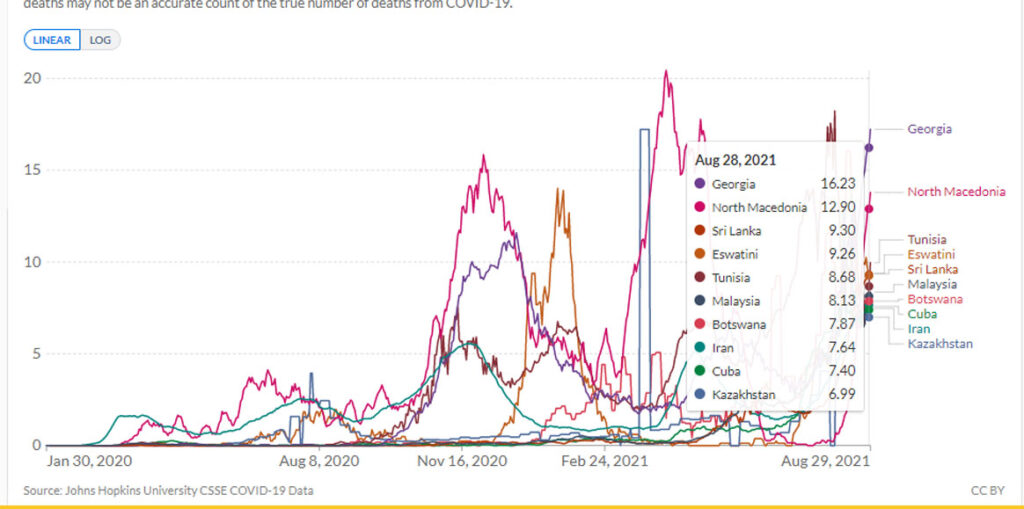 ඒ අනුව ශ්රී ලංකාවේ ජනගහණයෙන් මිලියනයකට කෙරෝනා මරණ 9.3 සිදුවෙමින් පවතින අතර ශ්රී ලංකාවට වඩා වැඩි මරණ සංඛ්යාවක් සිදුවන්නේ ජෝර්ජියාව ජනගහණය මිලියනයකට 16.2 සහ උතුරු මැසිඩෝනියාව ජනගණය මිලියනයකට 12.9ක් පමණි.