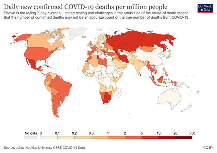 ජනගහණයට සාපේක්ෂව වැඩිම කොරෝනා මරණ සංඛ්යාවක් සිදුවන රටවල් අතර ශ්රී ලංකාව තුන්වැනි තැනට පත්ව ඇතැයි Global Change Data Lab මගින් සකසනු ලබන වාර්තාවල දැක්වේ. මෙම වාර්තා https://ourworldindata.org/ වෙබ් අඩවියේ ප්රකාශයට පත්කර ඇත.