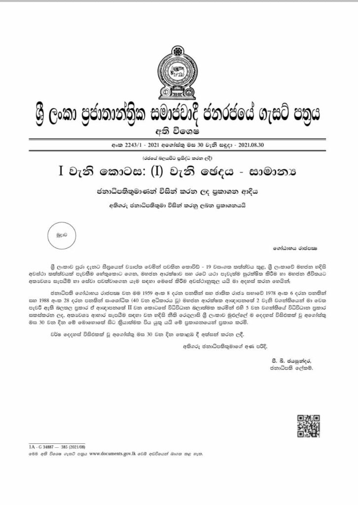 මහජන ආරක්ෂක ආඥා පනතේ 02 වැනි වගන්තියේ ජනාධිපිතවරයාට ඇති බලතල අනුව එම ආඥා පනතේ ii කොටසේ විධිවිධාන බලාත්මක කරමින් 05 වැනි වගන්තියේ විධිවිධාන ප්රකාරව මෙම ගැසට් නිවේදනය නිකුත් කර ඇත.