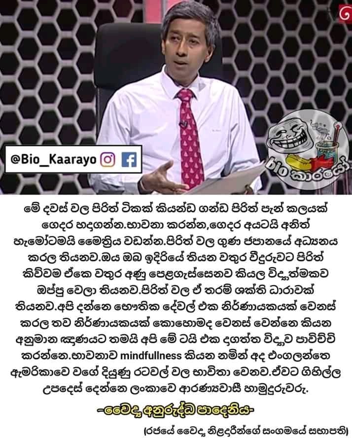 පිරිත් කියූ විට ජල අණුව වෙනස්වන බවත්, ඒ ගැන ජපානයේ පර්යේෂණ සිදුකර ඇති බවත් කියමින් රජයේ වෛද්ය නිලධාරීන්ගේ සංගමයේ වාරණයට ලක්ව සිටින සභාපති විශේෂඥ ළමා ස්නායු රෝග වෛද්ය අනුරුද්ධ පාදෙණිය පවසයි.