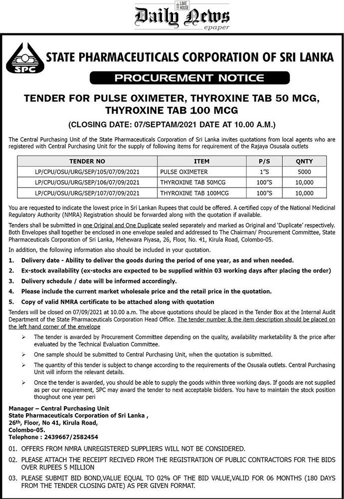ශ්රී ලංකා රාජ්ය ඖෂධ නීතිගත සංස්ථාව තයිරොක්සීන් ආනයනය සඳහා ටෙන්ඩර් කැඳවමින් අද (02) Dailynews පුවත්පතේ 14 වැනි පිටුවේ දැන්වීමක් පළ කර තිබේ.