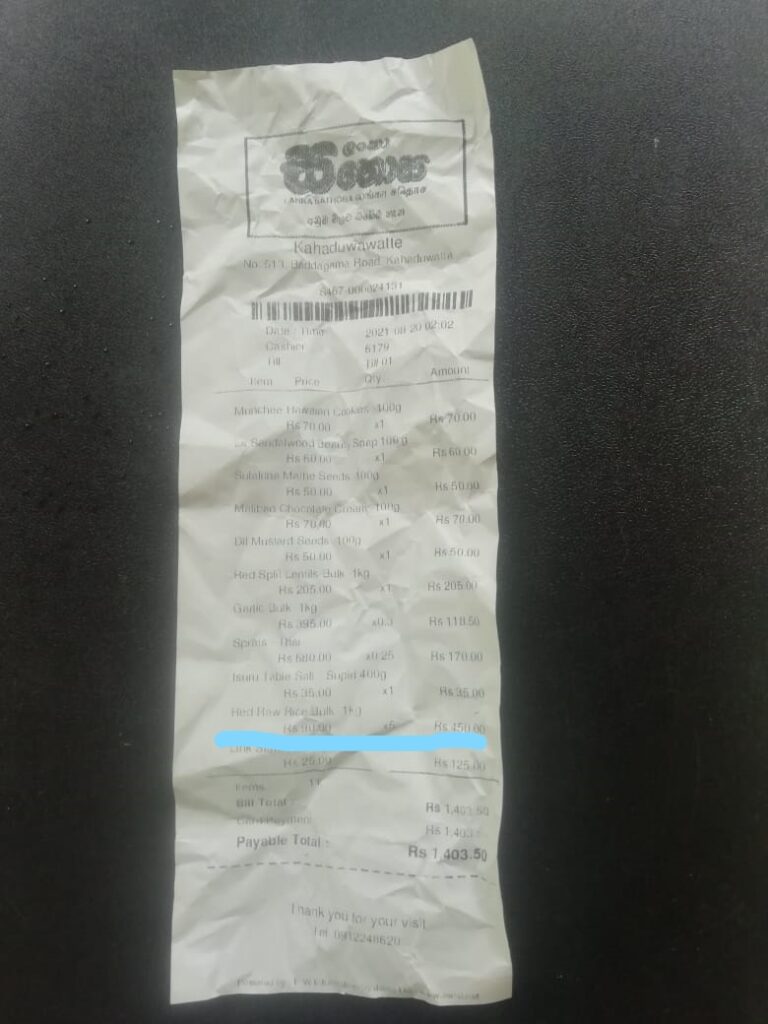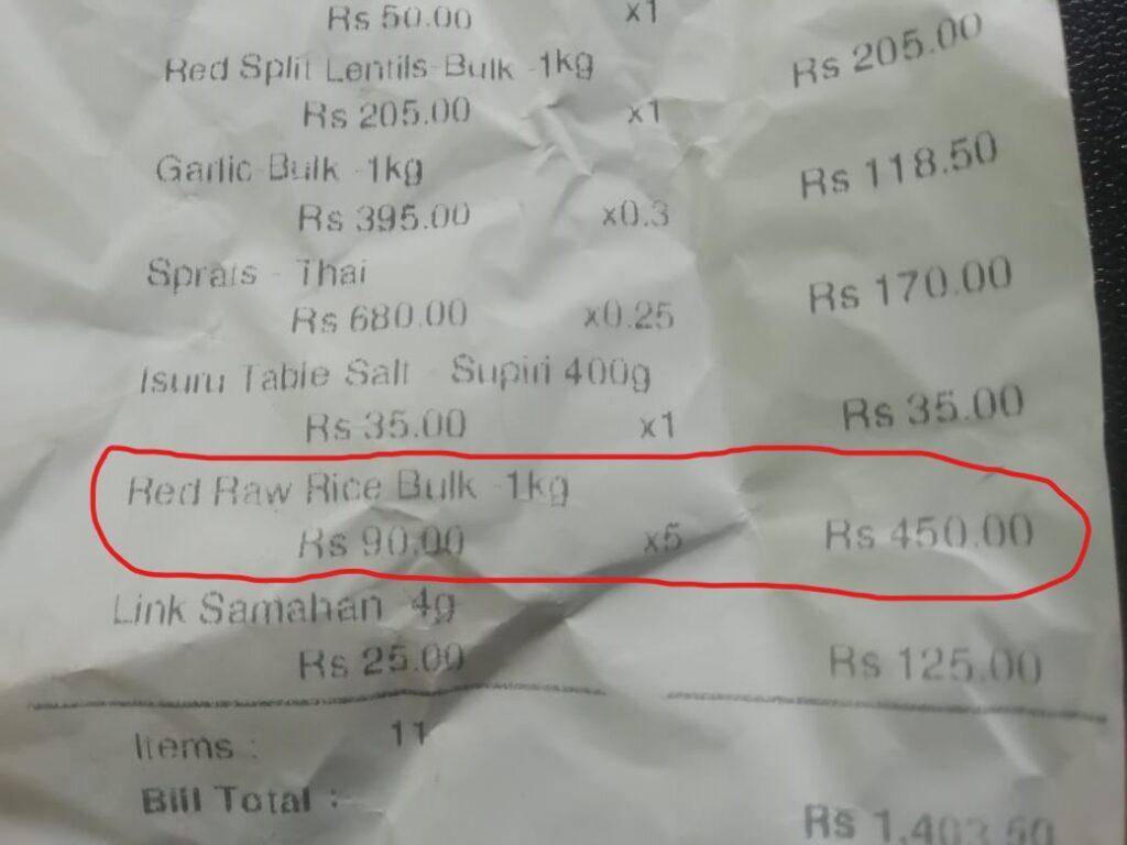 රට වසා දැමීමට පෙර පසුගිය අගෝස්තු 20 වැනි දා සතොස වෙළෙඳ සැළකින් ලබාගත් භාණ්ඩවල මිල බිල්පතක් පහත දැක්වෙයි. එහි රතු කැකුළු කිලෝ ග්රෑම් එකක මිල දැක්වෙන්නේ රුපියල් 90.00ක් ලෙසිනි. ඊයේ නිකුත් කළ ගැසට් නිවේදනය අනුව සහල් වෙළෙඳාමේ යෙදෙන පුද්ගලයන්ට සහල් මිල පැවති මිලටත් වඩා රුපියල් 5.00ක් වැඩිකර විකිණීමට අවස්ථාව හිමිවී තිබේ.