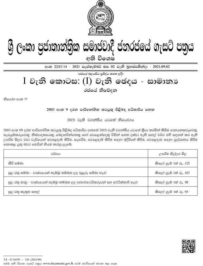 මේ අතර සුදු හා රතු කැකුළු කිලෝ ග්රෑම් එකක් සඳහා රුපියල් 95.00 ක්, සුදු හා රතු නාඩු කිලෝ ග්රෑම් එකක් සඳහා රුපියල් 98.00 ක්, සුදු හා රතු කැකුළු සම්බා කිලෝ ග්රෑම් එකක් සඳහා රුපියල් 103.00ක්, කීරි සම්බා කිලෝ ග්රෑම් එකක් සඳහා රුපියල් 125.00ක් වශයෙන් මෙම ගැසට් නිවේදන මගින් උපරිම සිල්ලර මිල නියම කර ඇත. මෙම ගැසට් නිවේදනයෙන් නියම කර තිබේ.