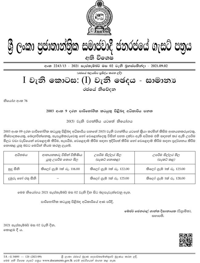 මේ අතර සීනි සඳහා ද උපරිම සිල්ලර මිලක් නියම කර ඇත.