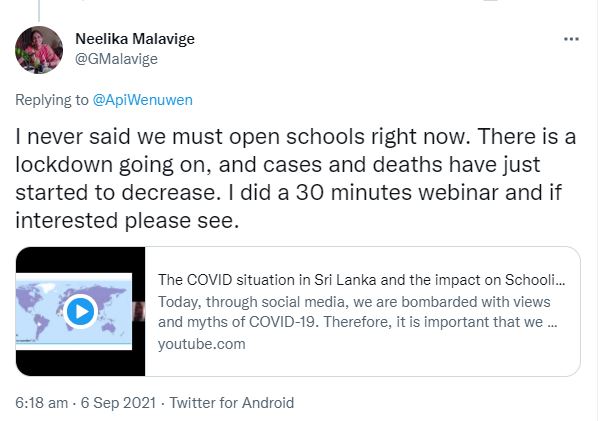 පාසල් විවෘත කළ හැකියැයි තමන් කීවේ නැතැයි මහාචාර්ය නීලිකා මලවිගේ ට්විටර් පණිවිඩයක් නිකුත් කරමින් පවසයි.