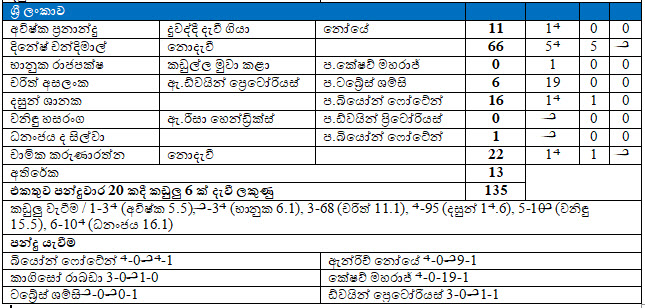 ඉනිම ආරම්භයේදී නොයේ විසින් පන්දුව කෙළින්ම කඩුල්ලට එල්ල කරමින් අවිෂ්ක ප්රනාන්දුව දවා ගැනීමට සමත්වීමෙන් අනතුරුව පිටියට පිවිසි භානුක රාජපක්ෂව මුහුණ දුන් පළමු පන්දුවෙන්ම දවා ගැනීමට කේෂව් මහරාජ් සමත්වීම ශ්රී ලංකා කණ්ඩායම පසු පාදයට තල්ලුකර දැමීය.