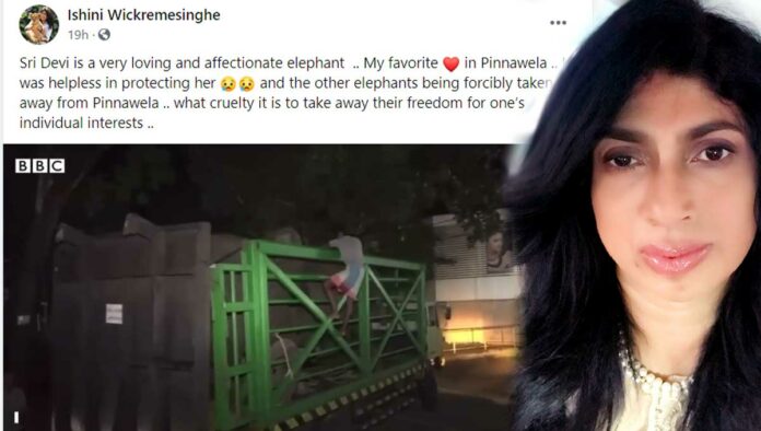 සමාජ මාධ්ය ඔස්සේ සටහනක් තබමින් ඇය කියා ඇත්තේ අලි අනාථාගාරයේ අලි ඇතුන් ආරක්ෂා කිරීමේ දී තමන් අසරණ වූ බවයි. එක් පුද්ගලයකු මෙලසෙ අලි රැගෙන යන බවත් ඇය පවසයි.