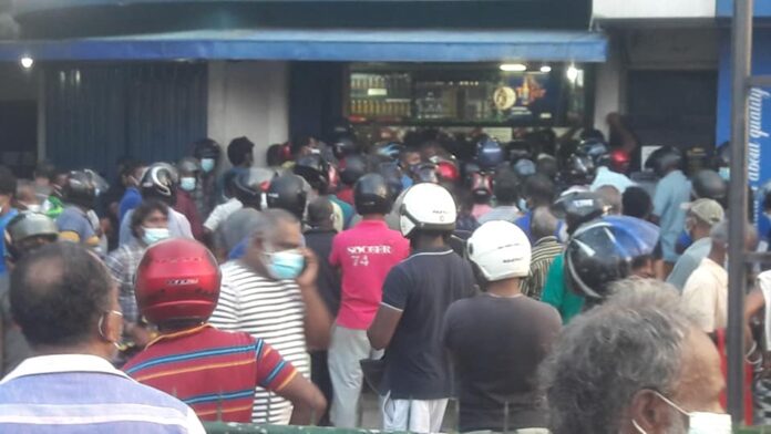 මත්පැන් අළෙවි සැල් විවෘතකිරීමට අවසර දී ඇතැයි සමාජ මාධ්ය ඔස්සේ ඊයේ (17) තොරතුරු වාර්තාවීම හේතුවෙන් රටේ බොහෝ ස්ථානවල මත්පැන් අළෙවි සැල් විවෘතකර තිබූ අතර විශාල පිරිසක් ඒවායේ රැස්වී මත්පැන් මිල දී ගන්නා ආකාරය ද දැකගත හැකිවිය.