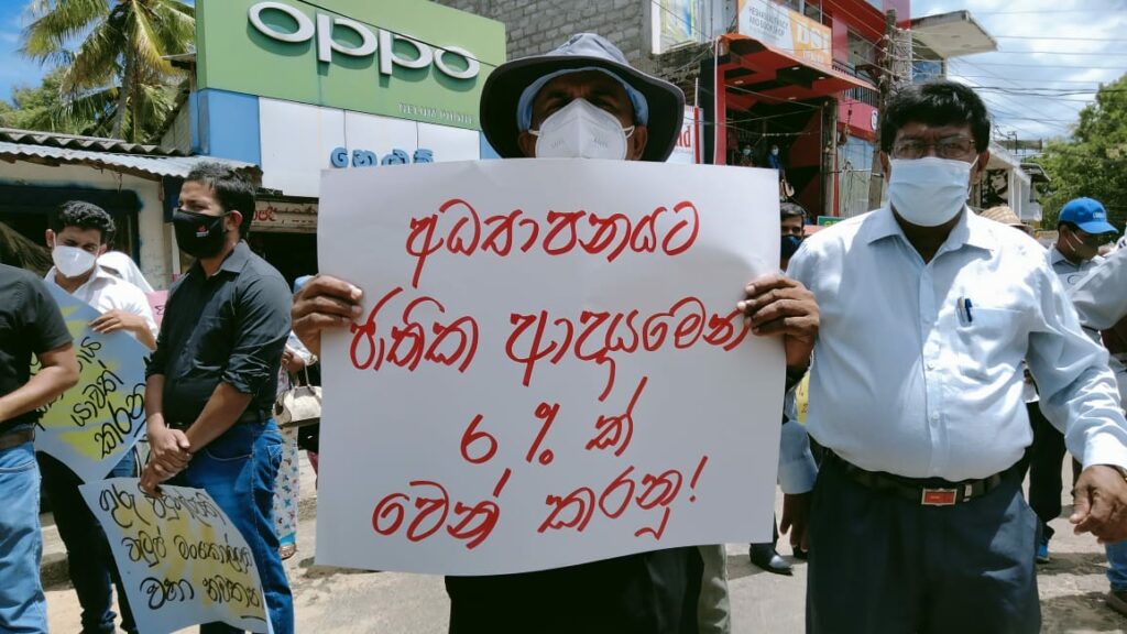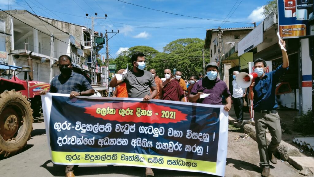 “අපි මේ උද්ඝෝෂණය කරලා රජයෙන් ඉල්ලන්නේ වහාම ගුරු විදුහල්පති වැටුප් විෂමතාව විසඳන්න කියලා. රජයේ ඇතැම් පිරිස් දරුවන්ගේ Online අධ්යාපනය ඇණ හිටලා කියා කිඹුල් කඳුළු හෙළනවා. රජයට ඔන්ලයින් අධ්යාපනය ආරම්භ කරන්න හෝ පවත්වාගෙන යාමට කිසිදු වැඩපිළිවෙලක් තිබුණේ නෑ. එය පටන්ගත්තේ ගුරුවරු ස්වේඡාවෙන් දරුවන් ගැන හිතලා. රජය ඒ වෙනුයෙන් කරපු දෙයක් නෑ. විද්යුත් නාලිකාවක් දරුවන්ගේ අධ්යාපනය වෙනුවෙන් වෙන්කරන්නවත් රජයේ උනන්දුවක් තිබුණේ නැහැ. අපේ වැටුප් විෂමතා ගැටලුව විසඳන තුරු අපි දිගටම වෘත්තීය ක්රියාමාර්ග ගන්නවා. මේ සඳහා ඕනෑම ක්රියාමාර්ගයකට අපි සූදානම්.”