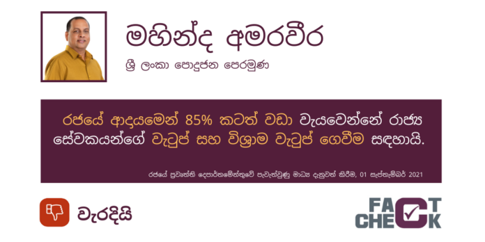 රජයේ ප්රවෘත්ති දෙපාර්තමේන්තුවේ දී මාධ්ය දැනුම්වත් කරමින් “රජයේ ආදායමෙන් 85%ට වඩා වැය වන්නේ රාජ්ය සේවකයන්ගේ වැටුප් සහ විශ්රාම වැටුප් ගෙවීමට” යැයි පරිසර අමාත්ය මහින්ද අමරවීර කරන ලද ප්රකාශය සත්යයෙන් තොර ප්රකාශයක් බව ඒ පිළිබඳ කරුණු සොයා බැලූ FactCeck.lk ආයතනය පවසයි.