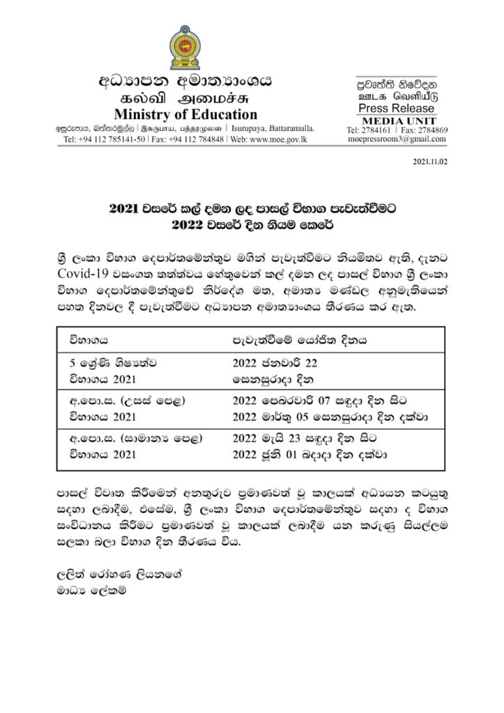 ඒ අනුව 2021 වර්ෂයේ 05 ශ්රේණියේ ශිෂ්යත්ව විභාගය 2022 ජනවාරි 22 පැවැත්වීමට කටයුතු යොදා තිබේ. 2021 අපොස උසස් පෙළ විභාගය 2022 පෙබරවාරි 07 වැනි සඳුදා සිට 2022 මාර්තු 05 වැනි සෙනසුරාදා දක්වා පැවැත්වෙයි.