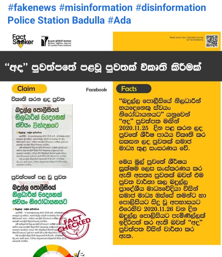 කෝවිඩ් 19 වසංගත තත්වය තුළ ජනතාව නොමග යන අන්දමේ වගකීමෙන් තොර සාවද්ය තොරතුරු සංසරණය වීම හේතුවෙන් සිදු වන බලපෑම අපට පෙනෙනවාට වඩා බොහෝ බරපතළ බව ආදිවාසි නායකයාගේ බිරිදගේ අභාවය සම්බන්දයෙන් පෙර සදහන් කල මාධ්යවේදිනිය සිය තැබු සටහනෙන් වඩාත් ගම්ය වේ.
