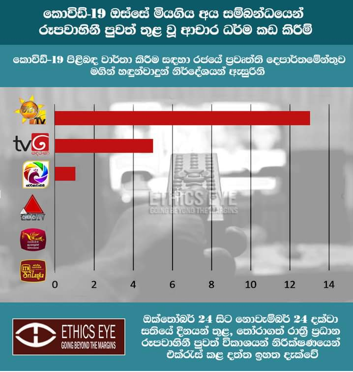 කෝවීඩ් – 19 ආසාදනය වීමෙන් මිය ගිය අය සම්බන්ධයෙන් ප්රධාන රූපවාහිනි නාලිකා කිහිපයක් පදනම් කරගනිමින් ETHICS EYE ආයතනය විසින් 2020 ඔක්තොම්බර් 24 සිට නොවැම්බර් 24 දක්වා සතියේ දිනයන් තුළ නිරීක්ෂණය කර එක්රැස් කර ගත් දත්ත වලට අනුව වැඩිම ප්රමාණයක් මාධ්ය සදාචාරයන් කඩකර ඇත්තේ පුද්ගලික රූපවාහිනි මාධ්ය ආයතන බව හෙලිවී තිබේ. කෙසේ වෙතත්, රාජ්ය මාධ්ය ආයතන හා එක් පුද්ගලික මාධ්ය ආයතනයක් පමණක් ප්රශස්ත ලෙස කටයුතු කර ඇති බවද හෙලිවී ඇත.