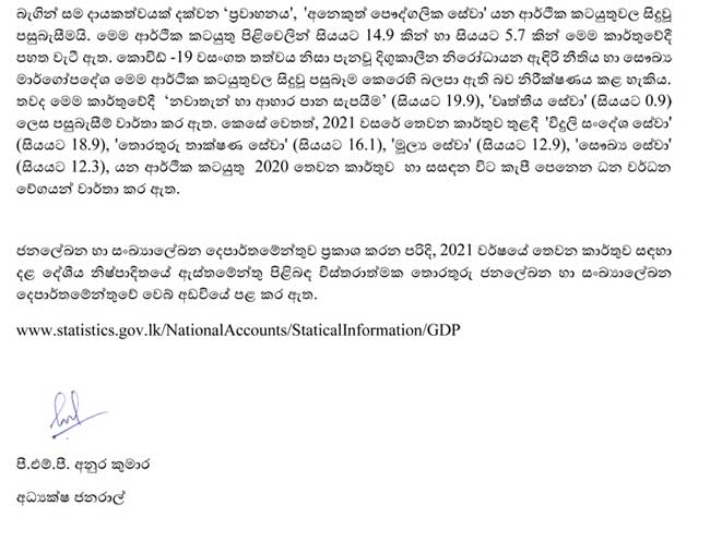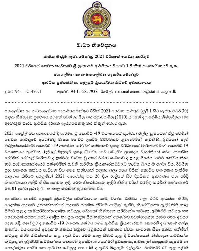 ශ්රී ලංකාවේ ආර්තික වර්ධනය 2021 වර්ෂයේ ජුනි සිට සැප්තැම්බර් දක්වා වූ තුන්වැනි කාර්තුවේ දී සෘණ අගයක් ගෙන ඇතැයි ජනලේඛන හා සංඛ්යාලේඛන දෙපාර්තමේන්තුවේ නිවේදනය දැක්වේ.