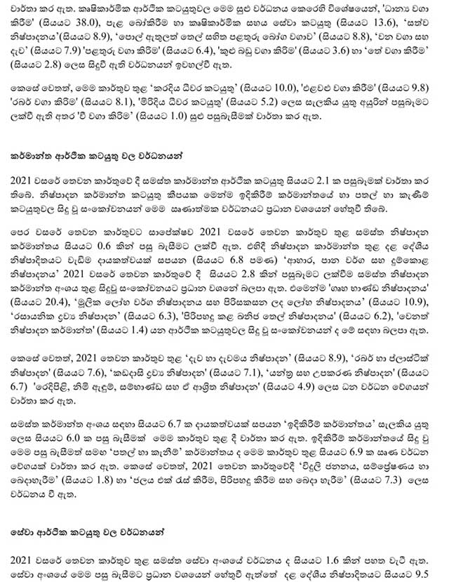 පසුගිය වසරේ තෙවන කාර්තුවේ දී එම ක්රියාකාරකම්වල ධන වර්ධන වේගයන් වාර්තා වී තිබුණු බව ද ජනලේඛන හා සංඛ්යාලේඛන දෙපාර්තමේන්තුව නිකුත් කළ නිවේදනයේ දැක්වේ.