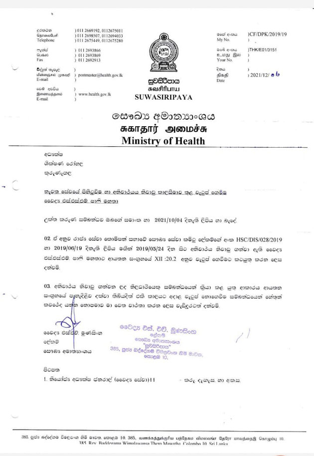 වඳ සැත්කම් කළැයි චෝදනා ලැබීම හේතුවෙන් අනිවාර්ය නිවාඩු යවා සිටි විශේෂඥ ප්රසව හා නාරි වෛද්ය එස්.එස්.එම්. සාෆි නිවාඩු යවා සිටි කාලයට අදාල සියලු වැටුප් ගෙවන ලෙස සෞඛ්ය අමාත්යාංශයේ ලේකම් වෛද්ය එස්.එච්.මුණසිංහ කුරුණෑගල රෝහලේ අධ්යක්ෂවරයාට නියෝග කර තිබේ.