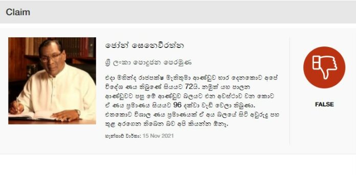 ශ්රී ලංකාව විදේශ ණය ලබාගැනීම පිළිබඳ පාර්ලිමේන්තු මන්ත්රී ජෝන් සෙනෙවිරත්න 2021 නොවැම්බර් 15 වැනි දා පාර්ලිමේන්තුවේ දී කරන ලද්දේ සාවද්ය ප්රකාශයක් බව FactCheck ආයතනය කරුණු සොයා බැලීමේ දී තහවුරු වී තිබේ.