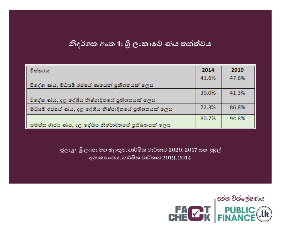 මහ බැංකු වාර්ෂික වාර්තාවන්ට අනුව 2014 වර්ෂයේ දී රජයේ සමස්ත ණය ප්රමාණය දළ දේශීය නිෂ්පාදිතයේ ප්රතිශතයක් ලෙස කත්විට 72.3%කි. එය 2019 වර්ෂයේ දී 86.8%කි. නමුත් ඒ අතරින් ද ආසන්න වශයෙන් හෝ සමාන වන්නේ 2014 වර්ෂයේ අගය පමණි. 2019 වර්ෂයේ ඔහු පවසා ඇති අගය 15% ක පරස්පරයක් තිබේ.
