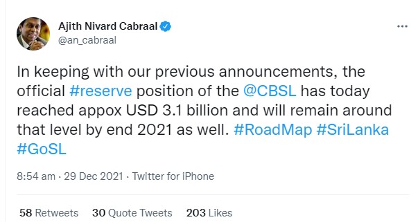 ශ්රී ලංකාවේ විදේශ සංචිත ප්රමාණය ඇමෙරිකානු ඩොලර් බිලියන 3.1 දක්වා අද (29) වනවිට ඉහළ ගොස් ඇතැයි මහ බැංකු අධිපති අජිත් නිවාඩ් කබ්රාල් twitter පණිවිඩයක් නිකුත් කරමින් කියා සිටියි.