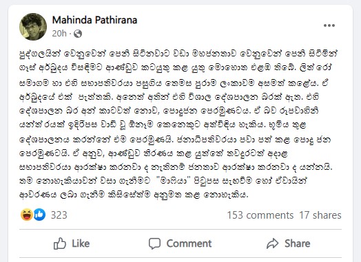 ලිට්රෝ සමාගමේ සභාපති තෙෂාර ජයසිංහ එම ධූරයන් ඉවත්කළ පසු ජනාධිපති නියෝගයෙන් යළි පත්කිරීම සම්බන්ධයෙන් විවේචනාත්මක අදහස් දැක්වීමක් ශ්රී ලංකා පුවත්පත් මණ්ඩලයේ සභාපති මහින්ද පතිරණ සමාජ මාධ්ය ජාලාවල පළකර තිබේ.