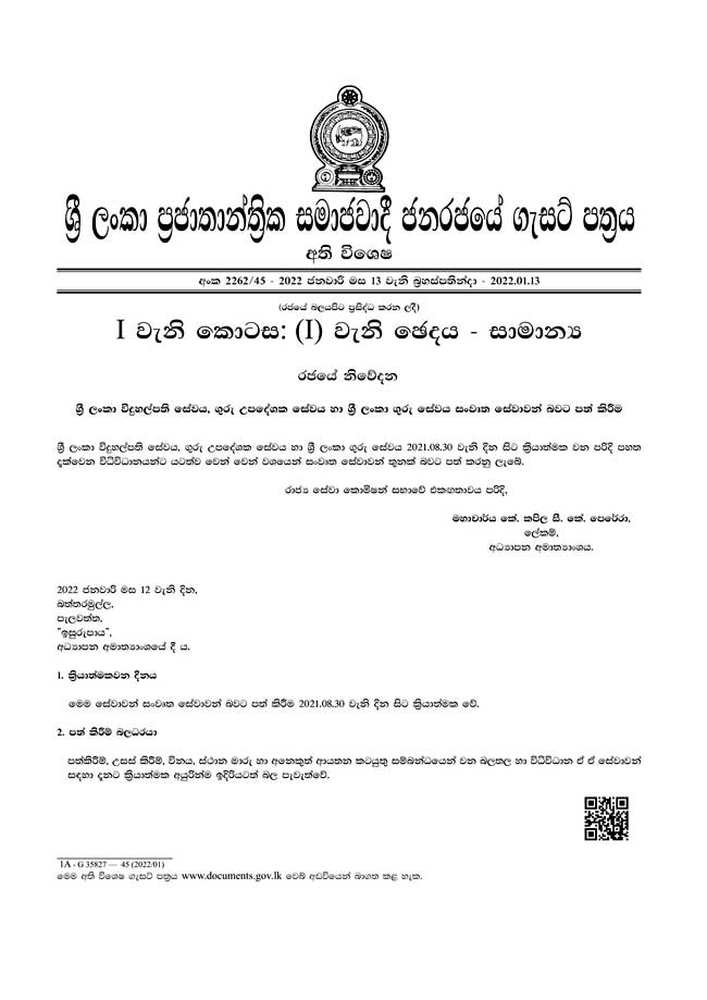 අමාත්යාංශ ලේකම් මහාචාර්ය කපිල පෙරේරා විසින් නිකුත්කර ඇති මෙම ගැසට් නිවේදනය අනුව 2021 අගෝස්තු 30 දින සිට ක්රියාත්මක වන පරිදි විදුහල්පති සේවය, ගුරු උපපදේශක සේවය හා ගුරු සේවය සංවෘත සේවාවක් බවට පත්කර තිබේ.