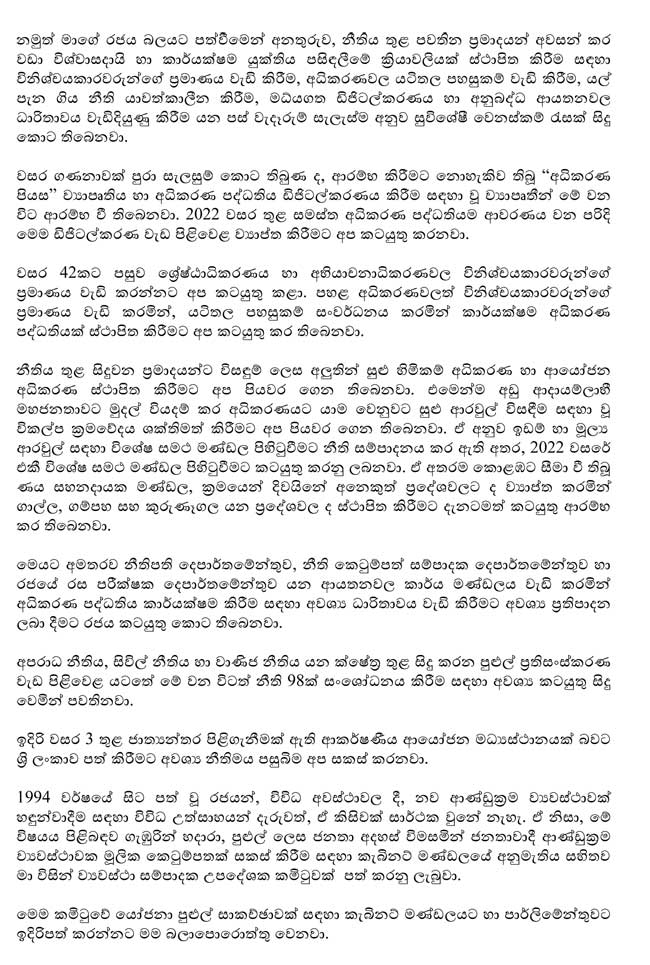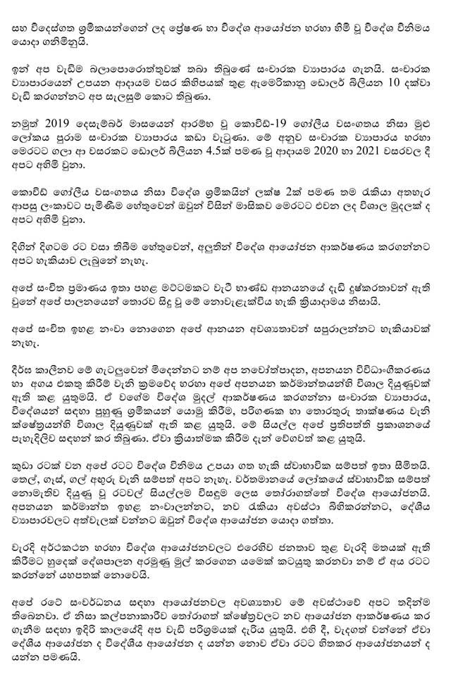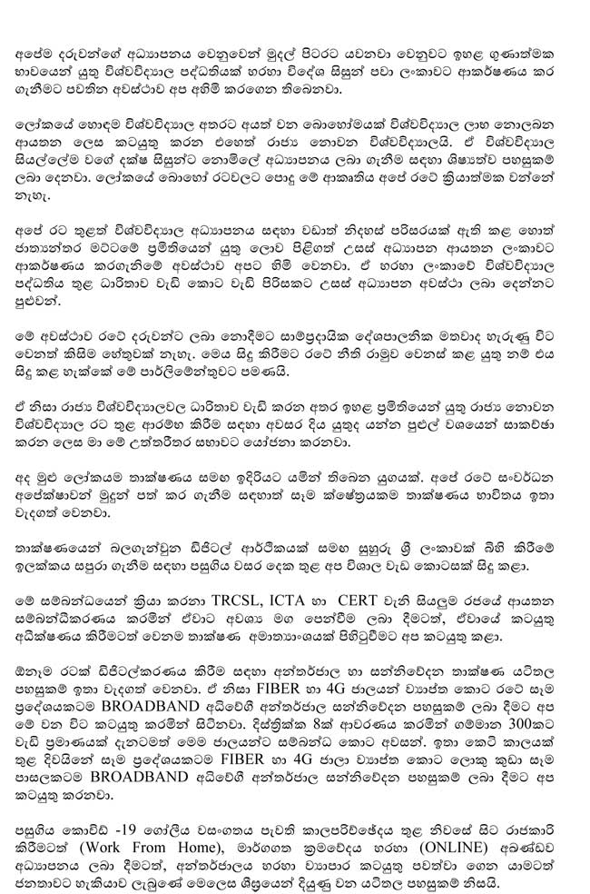 ගෝලීය කොරෝනා වසංගතය හේතුවෙන් පිඩාවට පත්ව සිටින මෙවන් අවස්ථාවක රට ගොඩනැගීම සඳහා එක්ව කටයුතු කිරීමේ ජාතික වගකීම සියලු මහජන නියෝජිතයන්ට පැවරෙන බව ද ජනාධිපතිවරයා කීවේය. වසර 05 ක් තුළ නිශ්චිත වැඩ කොටසක් ඉටුකිරීමට ජනතාවට පොරොන්දු වුවද කොරෝනා හේතුවෙන් බාධා එල්ල වූව බව ද එහෙත් රජයේ වගකීම ඉටුකිරීම කිසිම අවස්ථාවක අමතක නොකරන බව ද ජනාධිපතිවරයා සිය කතාවේ දී සඳහන් කළේය.