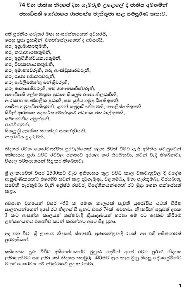 ජනාධිපති ගෝඨාභය රාජපක්ෂ විසින් සිදුකළ සම්පූර්ණ කතාව පහතින්