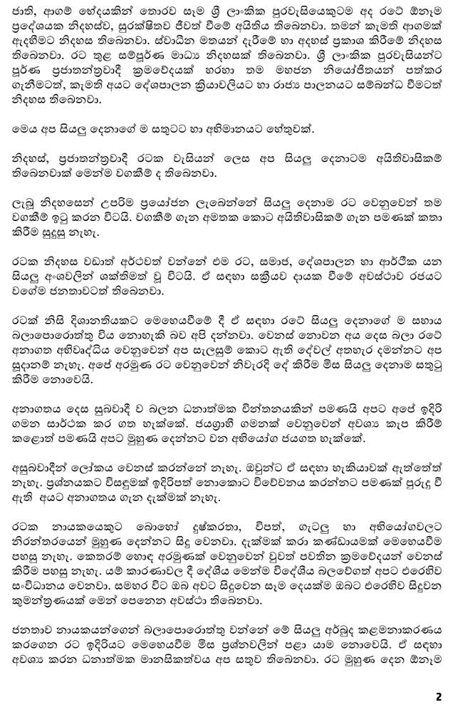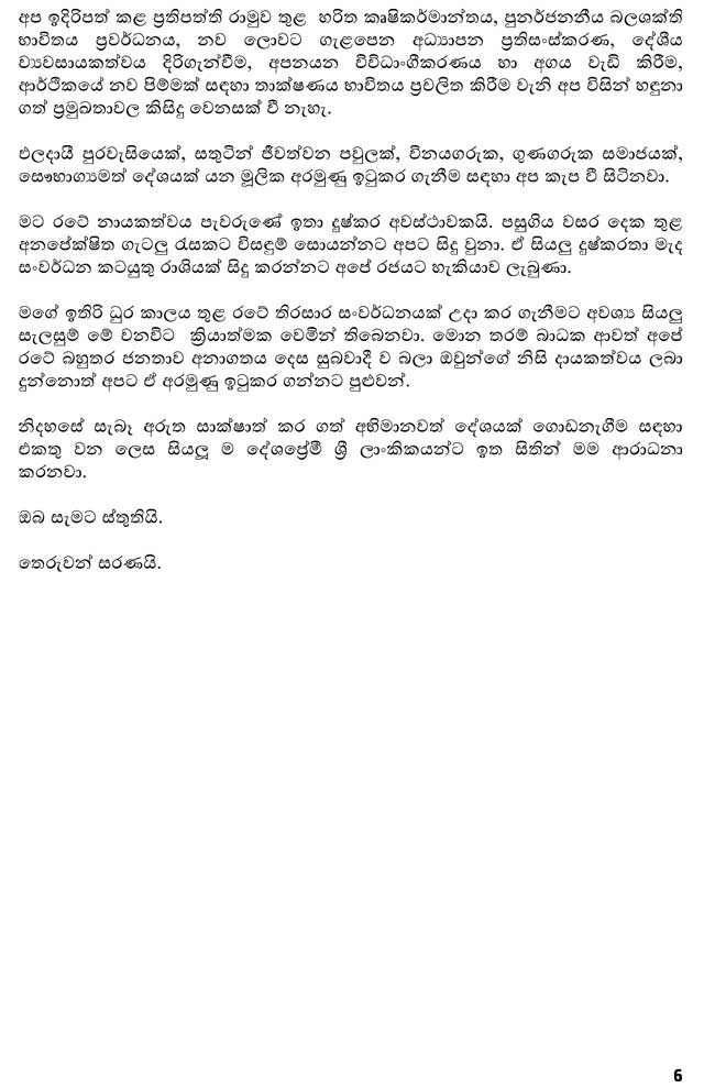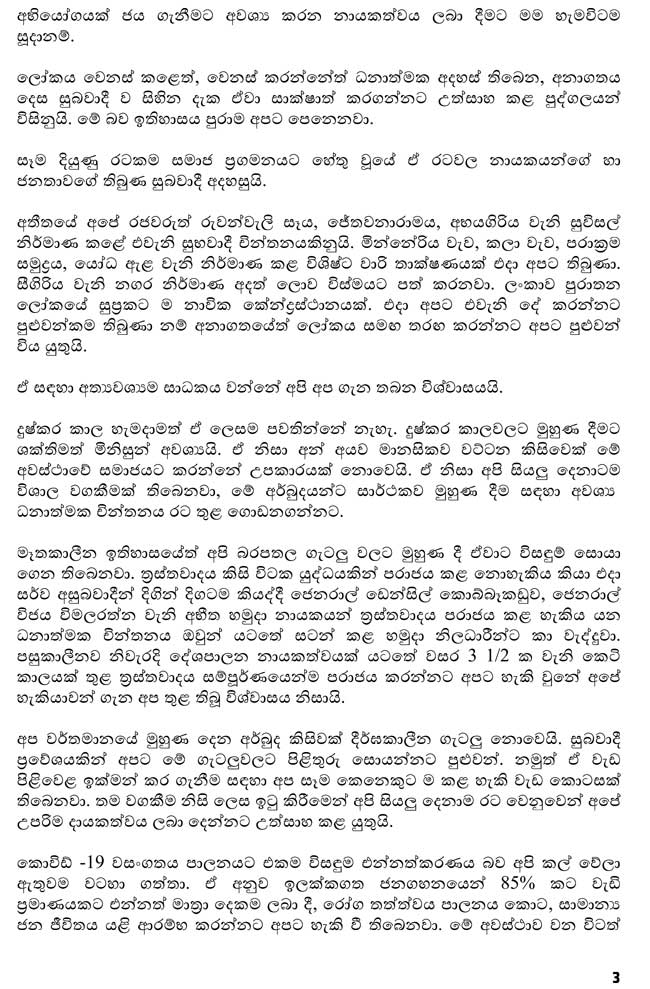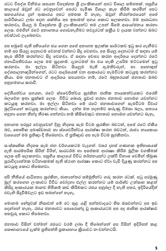 “රටක් නිසි ලෙස මෙහෙයවීමේදී රටේ සියලුම දෙනාගේ සහය නොලැනෙ බව අපි දන්නවා. වෙනස් විය නොහැකි අය ගැන සිතා අතහැර දැමීමට අපි සූදානම් නැහැ. අනාගතය දෙස සුබවාධීව බලන චින්තනයකින් පමණයි අපිට සාර්ථකත්වය ළඟා කරගත හැකිවෙන්නේ. විවේචනයට පමණක් පුරුදු වූ අයට අනාගතය ගැන දැක්මක් නෑ. මෙහි දී දේශීය වගේ ම විදේශීය බලවේගත් අපිට එරෙහිව සංවිධානය වෙනවා. නායකයකුගෙන් ජනතාව බලාපොරොත්තු වෙන්නේ ප්රශ්නවලින් පලායාම නොවෙයි. රට මුහුණ දෙන ඕනම අභියෝගයක් යජගත හැකි නායකත්වය ලබාදීම මම හැමවිටම සූදානම්. අනාගතය දෙස සුබවාදීව සිහින දැකපු අය තමයි ලෝකය වෙනස් කරන්නේ. මා ජනාතාවට ලබාදුන් ප්රතිඥා සැමවිටම සුරකිනවා කියලත් මොනම හේතුවක් නිසාවත් මේ රට තුළ යළි අන්තවාදය හිස එසවීමට ඉඩ නොතබන බවත් මා යළිත් මතක්කරනවා.”