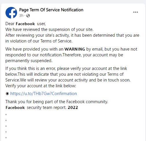 එහි දී ඔබට කමෙන්ටුවක් ලෙස පණිවිඩයක් ලැබෙයි. මේ පණිවිඩයෙන් දැක්වෙන්නේ ආරක්ෂිත ප්රශ්නයක් පිළිබඳ ඊමේල් පණිවිඩ මගින් ඔබව මීට පෙර අවස්ථා කිහිපයක දී ම දැනුම්වත් කර ඇතත්, ඔබ ඊට ප්රතිචාර නොදක්වා ඇති බැවින් මේ ඔබගේ ප්රොෆයිල් එක හෝ ෆේස්බුක් පිටුව සම්පූර්ණයෙන් ම ඉවත්කිරීමට කටයුතු කරන බවයි.