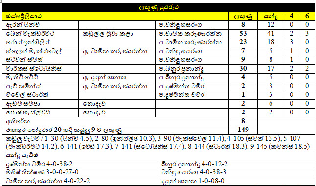 ඒ වනවිට නිශ්ශංක පන්දු 37කින් ලකුණු 36ක් ලබා සිටි අතර අසලංක පන්දු 19කින් ලකුණු 16ක් ලබා සිටියේය. පිටියේ එක් වූ වනිඳු හසරංග සහ නායක දසුන් ශානක ඉනිම ගොඩගැනීමට උත්සාහ ගත්ත ද ඔවුන්ට ද සාර්ථකවීමට ඕස්ට්රේලියානුවෝ ඉඩ දුන්නේ නැත.