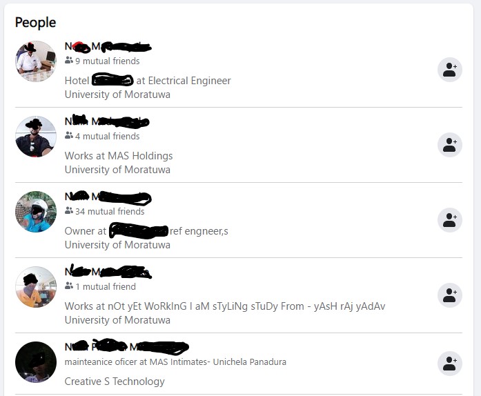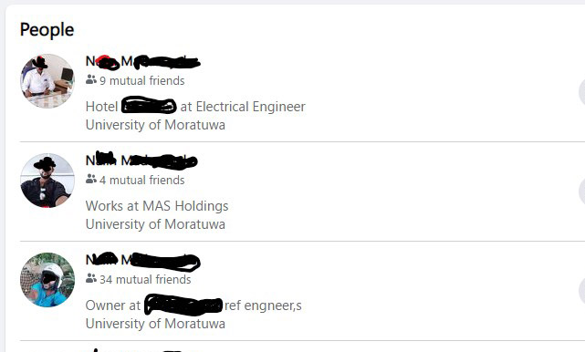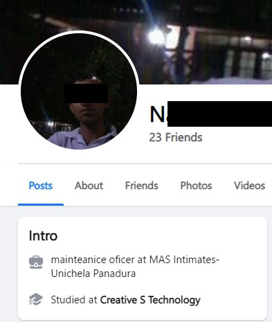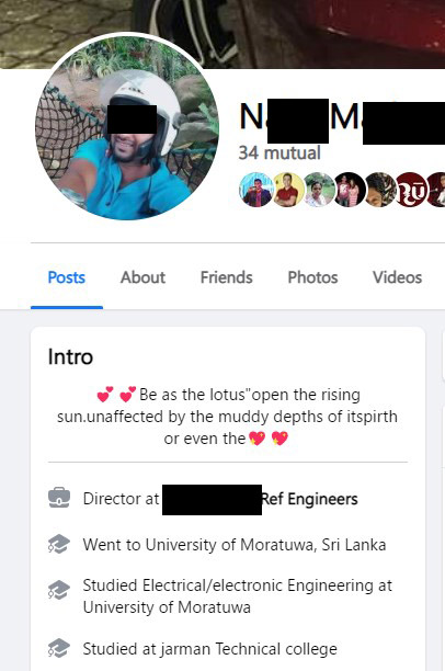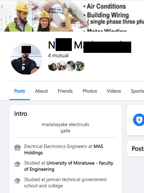 එම facebook ගිනුම් භාවිතා කරමින් රුහුණ විශ්වවිද්යාලයේ ඉංජිනේරු පීඨයේ ඉගෙනුම ලැබූ ඉංජිනේරුවකු ලෙසත්, වෛද්ය පීඨයේ ඉගෙනුම ලැබූ වෛද්යවරයකු ලෙසත් පෙනී සිටින ඔහු තමන් රිච්මන්ඩ් විද්යාලයේ ආදි සිසුවකු ලෙස ද පවසයි. නමුත් ඔහු රිච්මන්ඩ් විද්යාලයේ ආදි සිසුවකු නොවන බව අප කළ විමර්ශනවල දී තහවුරු විය. විශ්වවිද්යාල අධ්යාපනයක් ලබා නොමැති ඔහු තවත් සමාජ මාධ්ය ගිනුමක සඳහන් කර ඇත්තේ තමන් Mas Holdings ආයතනයේ සේවය කරන බවයි. යුනිචෙලා ආයතනයේ සේවය කරන බව ද තවත් ගිනුමක සඳහන් කර ඇත.