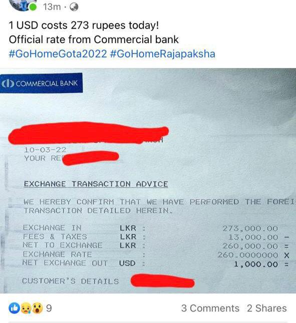 මහ බැංකුව නිවේදනයක් නිකුත් කරමින් ඇමෙරිකානු ඩොලරයක් රුපියල් 230.00ක් බව ප්රකාශ කළ ද ශ්රී ලංකාවේ වාණිජ බැංකුවල ඩොලරයක විකුණුම් මිල රුපියල් 275.00කි.