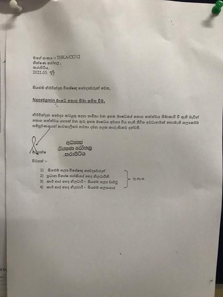 රෝහලේ අධ්යක්ෂ වෛදධ්ය ෂෙල්ටන් පෙරේරා විසින් ඒ සම්බන්ධයෙන් සියලුම විශේෂඥ නිර්වින්දන වෛද්යවරුන්ට, විශේෂඥ ශල්ය වෛද්යවරුන්ට, විශේෂ ශ්රේණියේ හෙද නිලධාරීන්ට, කාර්යභාර හෙද නිලධාරීන්නට ලිඛිතව දන්වා ඇත.