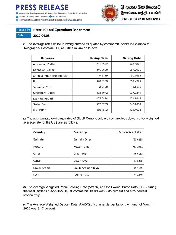 මේ වනවිට ලෝකයේ දුර්වල ම මුදල් ඒකකය ලෙස පිළිගැනෙන රුපියලේ අවප්රමාණවීම වඩාත් වේගයෙන් සිදුවන අතර එක්සත් ජනපද ඩොලරයක් ගැනුම්මල රුපියල් 310.88ක් බවත් විකුණුම් මිල රුපියල් 321.49ක් බව ශ්රී ලංකා මහ බැංකුව නිවේදනය කර තිබේ.