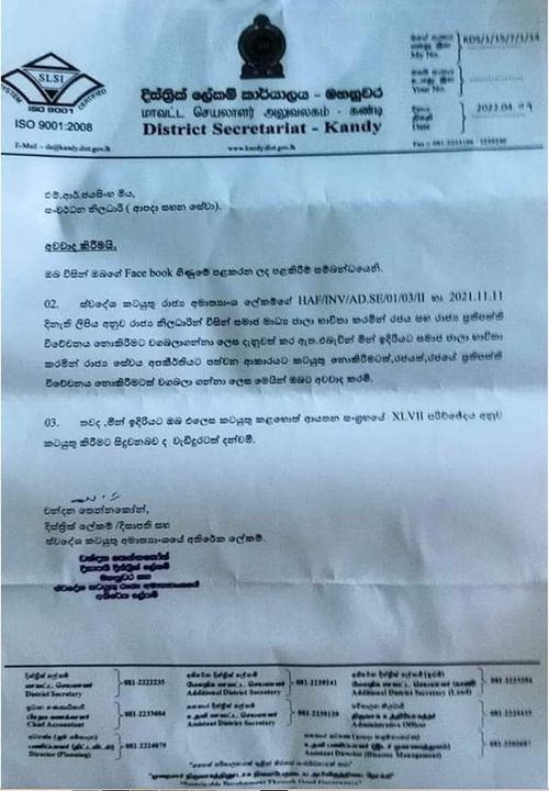 එම අනීතික ලිපියකට අනුව යමින් මහනුවර දිස්ත්රික් ලේකම්වරයා විසින් තම කාර්යාලයේ සේවයේ නිරත නිලධාරිනියකට අවවාද කිරීම ද නීති විරෝධී කටයුත්තකි.