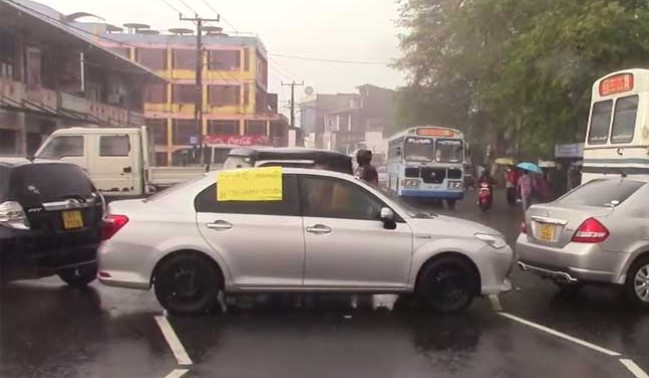 උද්ඝෝෂකයෝ ඉන්ධන නොලැබුණු තම වාහන යොදා මාර්ගය හරස්කර උද්ඝෝෂණයේ නිරත වෙති.