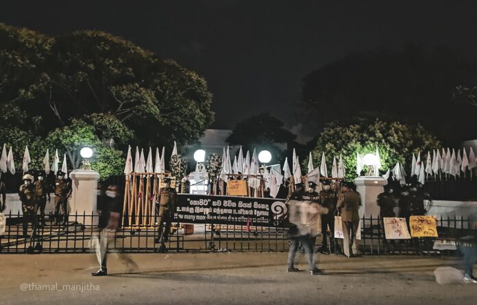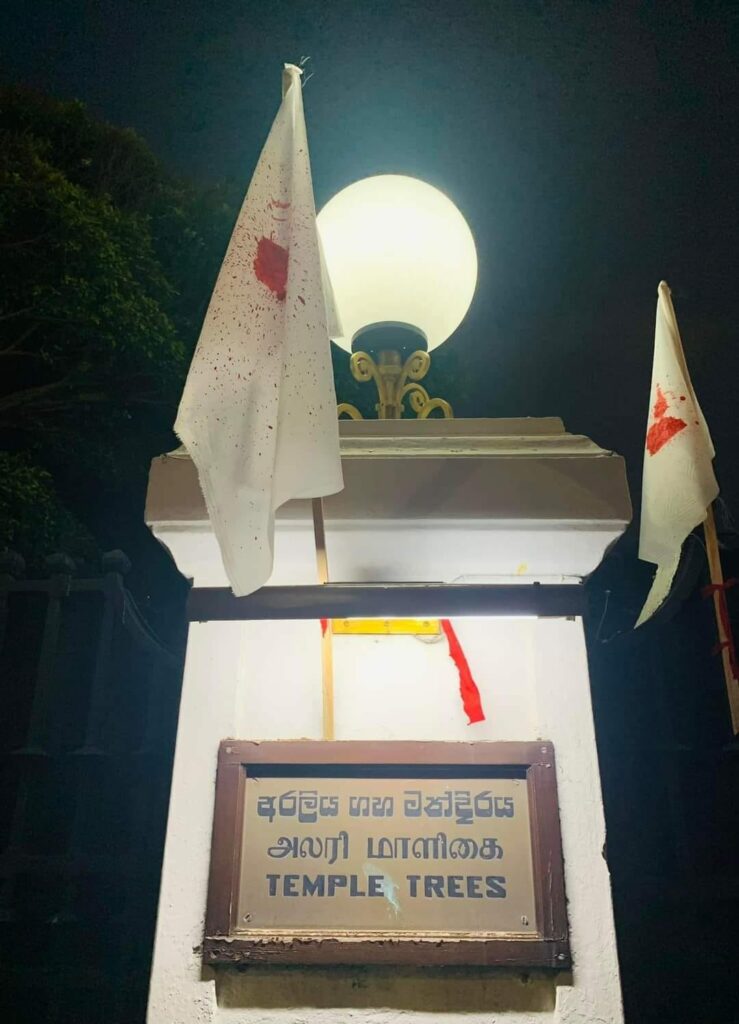 ශ්රී ලංකාවේ අග්රාමාත්ය නිල නිවස වන අරලියගහ මන්දිරය ඉදිරිපිටට අද අවමංගල්ය පෙරහැරකින් පැමිණි විරෝධතා කරුවන් පිරිසක් එහි ඇතුළුවීමේ දොරටුවේ සහ තාප්පයේ රුධිර පැල්ලම් සිහිපත් කරන රතු තීන්ත සහිත සුදු කොඩි ඔසවා විරෝධතාවක් පැවැත්වූහ.