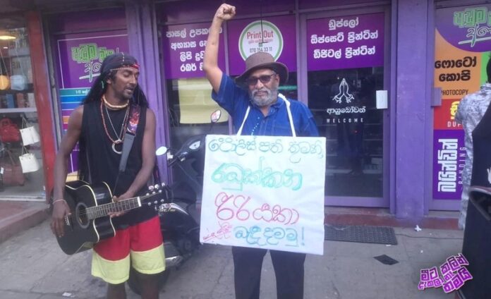 “පොලිස්පති තුමනි, රඹුක්කන රීරි යකා බැඳ දමමු” යනුවෙන් සඳහන් පුවරුවක් ඔහු තම ගෙලෙහි ඉල්ලාගෙන මේ විරෝධතාවයේ නිරතවූයේය. ඔහුගේ මේ විරෝධය විශාල පිරිසකගේ අවධානයට ලක්වූ අතර එහි ඡායාරූප මේ වනවිට සමාජ මාධ්ය ජාලා ඔස්සේ වේගයෙන් සංසරණය වෙමින් පවතී.