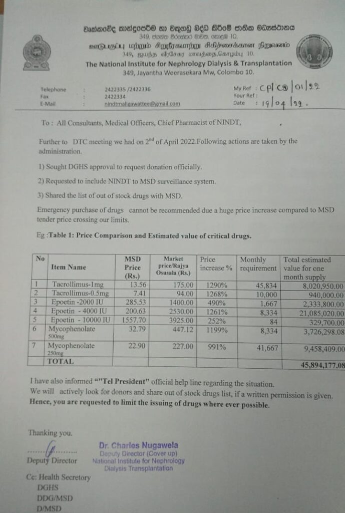 වෘක්කවේද කාන්දුපෙරීම හා වකුගඩු බද්ධ කිරීමේ ජාතික මධ්යස්ථානයේ අධ්යක්ෂ චාර්ල්ස් නුගවෙල යවන ලද ලිපියක දක්වා ඇති කරුණු පරීක්ෂා කිරීමේ දී පෙනී යන්නේ මේ වනවිට වකුගඩු රෝගීන් සඳහා අත්යාවශ්ය ඖෂධ අධික මිලට ගැනීමට සිදුව ඇති බවයි.