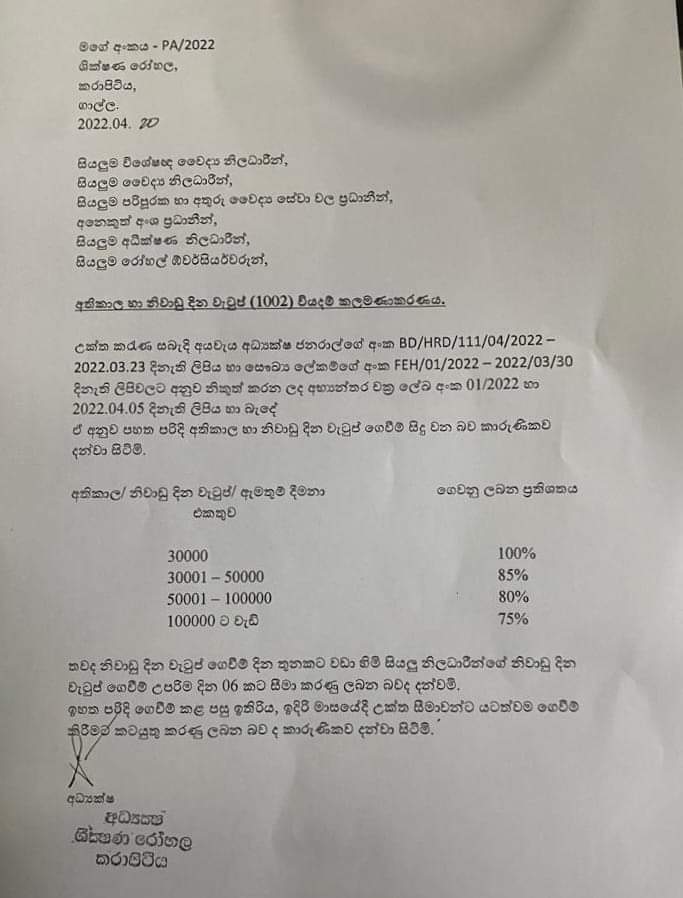 මීට අමතරව නිවාඩු දින වැටුප් ගෙවීම් දින තුනකට වඩා හිමි සියලු නිලධාරීන්ට එවැනි දින 06ක උපරිමයකට යටත්ව ගෙවීම් කරනු ලබන බව ද දන්වා ඇත.
