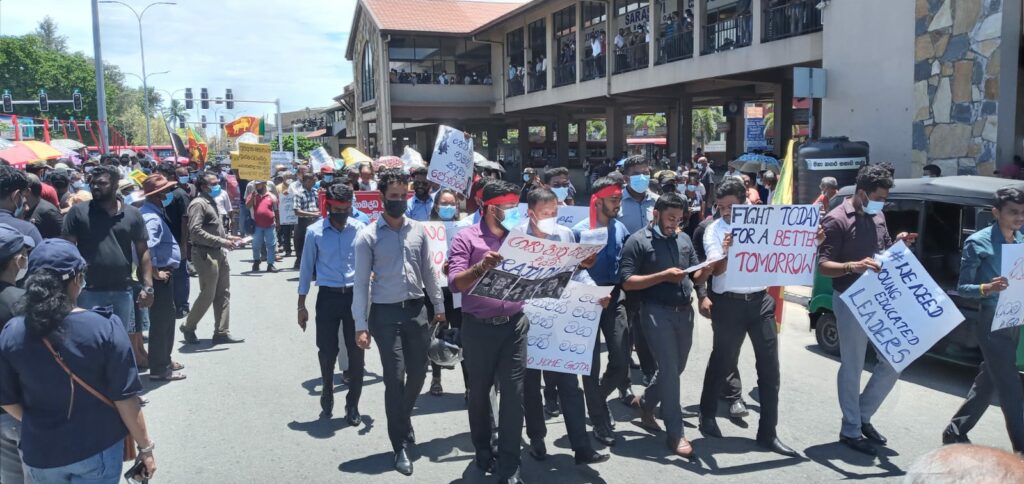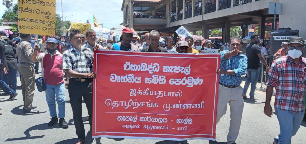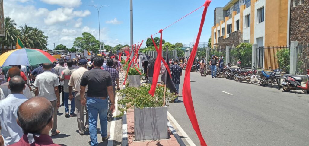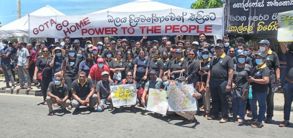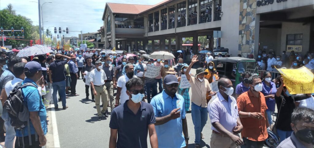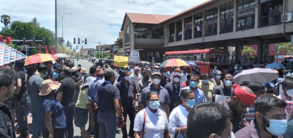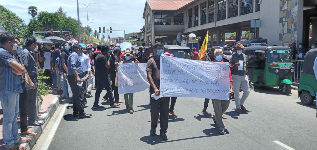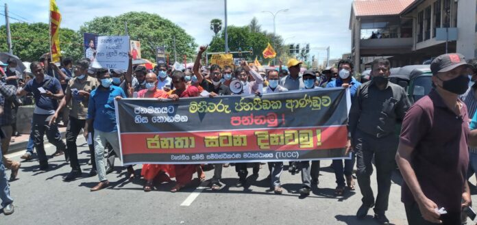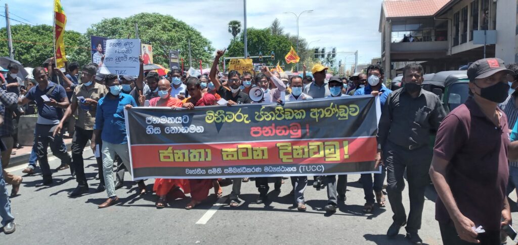“ජන මතයට හිස නොනමන, මිනීමරු ජන පීඩක ආණ්ඩුව පන්නමු” යනුවන්, වෘත්තීය සමිති සම්බන්ධීකරණ මධ්යස්ථානය මෙම විරෝධතාව සංවිධානය කර තිබිණි.