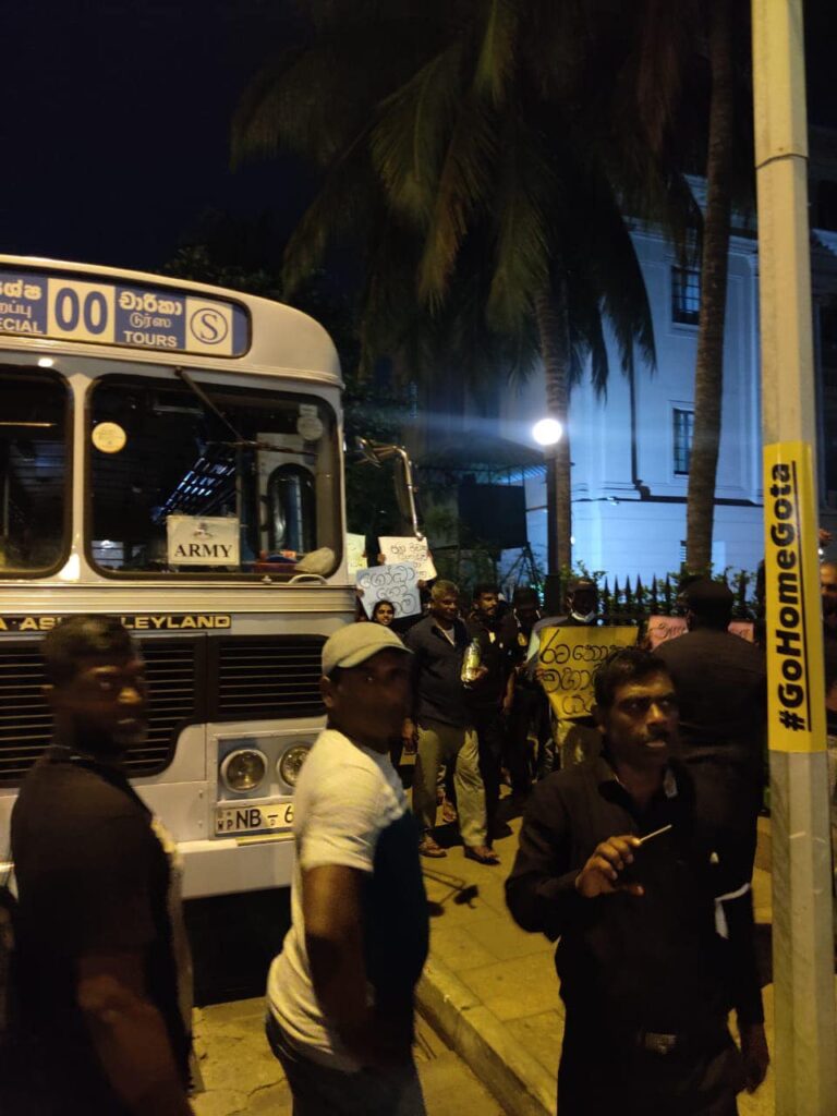 කොළඹ ජනාධිපති ලේකම් කාර්යාලය ස්ථාපිත කර ඇති පැරණි පාර්ලිමේන්තු ගොඩනැගිල්ලේ මුදල් අමාත්යාංශය ඉදිරිපිටට හමුදා බස්රථ කිහිපයකින් සිවිල් ඇඳගත් පිරිසක් පැමිණ ඇතැයි එහි සිටින අපට තොරතුරු සපයන්නෝ කියති.