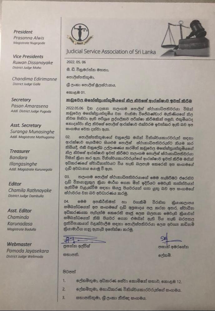 ස්වාධීන අධිකරණයක පැවැත්ම කෙරෙහි සෘජු ලෙස බලපාන මෙවැනි ක්රියාවන් සම්බන්ධයෙන් නිසි පියවර ගෙන එමගින් ඇතිවිය හැකි බරපතල ප්රතිවිපාක වළක්වාගැනීම සඳහා පොලිස්පතිවරයා අවශ්ය කඩිනම් ක්රියාමාර්ග ගනු ඇතැයි ද එම සංගමය දන්වා ඇත.
