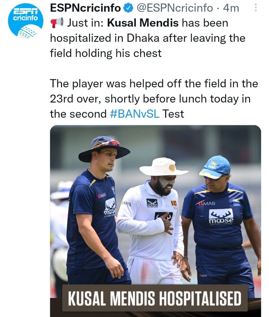 බංග්ලාදේශය සහ ශ්රී ලංකාව අතර ආරම්භ වූ දෙවැනි ටෙස්ට් තරඟයේ 23 වැනි පන්දුවාරයේ දී පපුව අල්ලාගෙන වේදනාවෙන් පිටියෙන් ඉවත්වූ ශ්රී ලංකා පිතිකරු කුසල් මෙන්ඩිස් ධකා නුවර රෝහලකට ඇතුළත්කර ඇතැයි ජාත්යන්තර ක්රිකට් විස්තර විචාරකයෝ කියති.