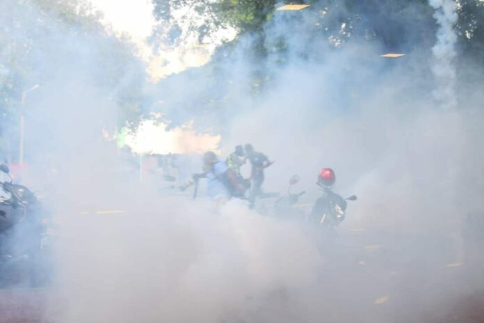 උද්ඝෝෂකයන් පොලිස් මාර්ග බාධක පෙරළමින් ඉදිරියට යාමට උත්සාහ ගැනීමත් සමඟ පොලිසිය ජල ප්රහාර සහ කඳුළුගෑස් ප්රහාර එල්ල කළේය.