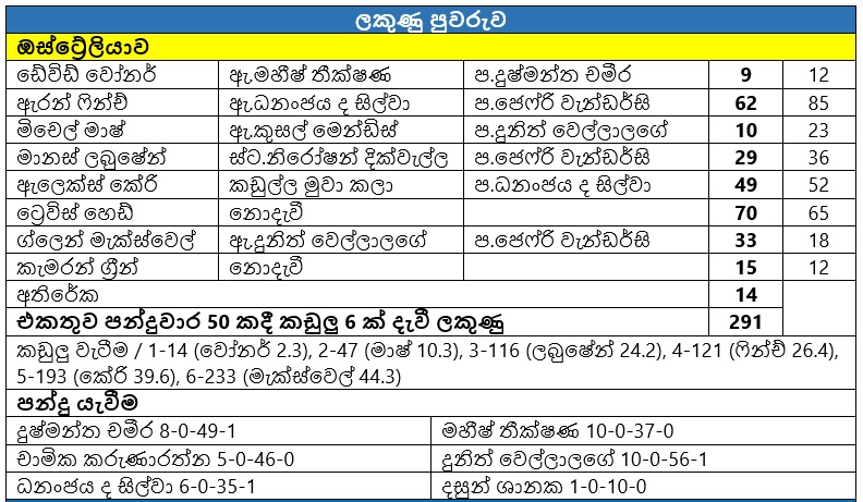 ඛෙත්තාරාම ක්රීඩාංගණයේ රාත්රී කාලයේ දෙවනුව පන්දුවට පහර දෙමින් ලකුණු 292ක් ලබා ගැනීම පහසු කාර්යයක් නොවූව ද ඕස්ට්රේලියානු අභියෝගය භාරගත් ශ්රී ලංකා පිතිකරුවෝ පැකිළීමකින් තොරව ම ආරම්භයේ සිට සිය ඉලක්කය කරා ගමන් කළහ.