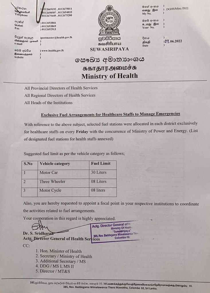 මෙම තෙල් තොග වෙන්කර ඇත්තේ සෞඛ්ය සේවාවට බව දැක්වෙන ලේඛනය සහ සෞඛ්ය අමාත්යාංශය මගින් නිකුත්කර ඇති ලබාදෙන ඉන්ධන ප්රමාණ සඳහන් ලේඛනය පහතින් සඳහන් කර ඇත.