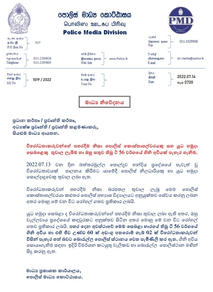 බත්තරමුල්ල, පොල්දූව හන්දියේ දී විරෝධතාකරුවන් විසින් යුද හමුදා ගිනි අවියක් සහ ජීව උණ්ඩ තොගයක් පැහැරගෙන ඇතැයි යුද හමුදාව විසින් බොරැල්ල පොලිසියට පැමිණිල්ලක් ඉදිරිපත් කර තිබේ.