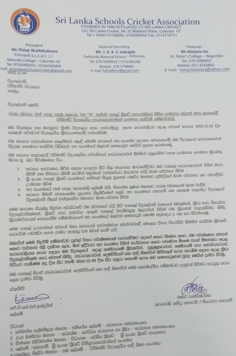 පාසල් ක්රිකට් සංගමයේ ලේකම් ජේ.ඒ.කේ.එස්.ඉන්ද්රජිත් විසින් අත්සන් කරමින් රිච්මන්ඩ් විදුහල්පතිවරයාට යොමුකර ඇති ලිපියක මේ බව සඳහන් කර ඇත.